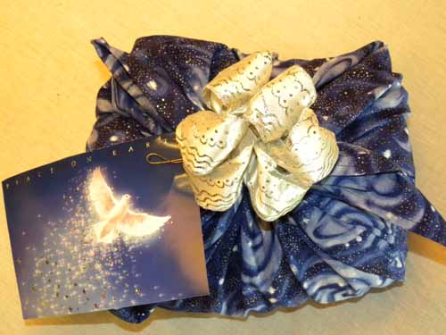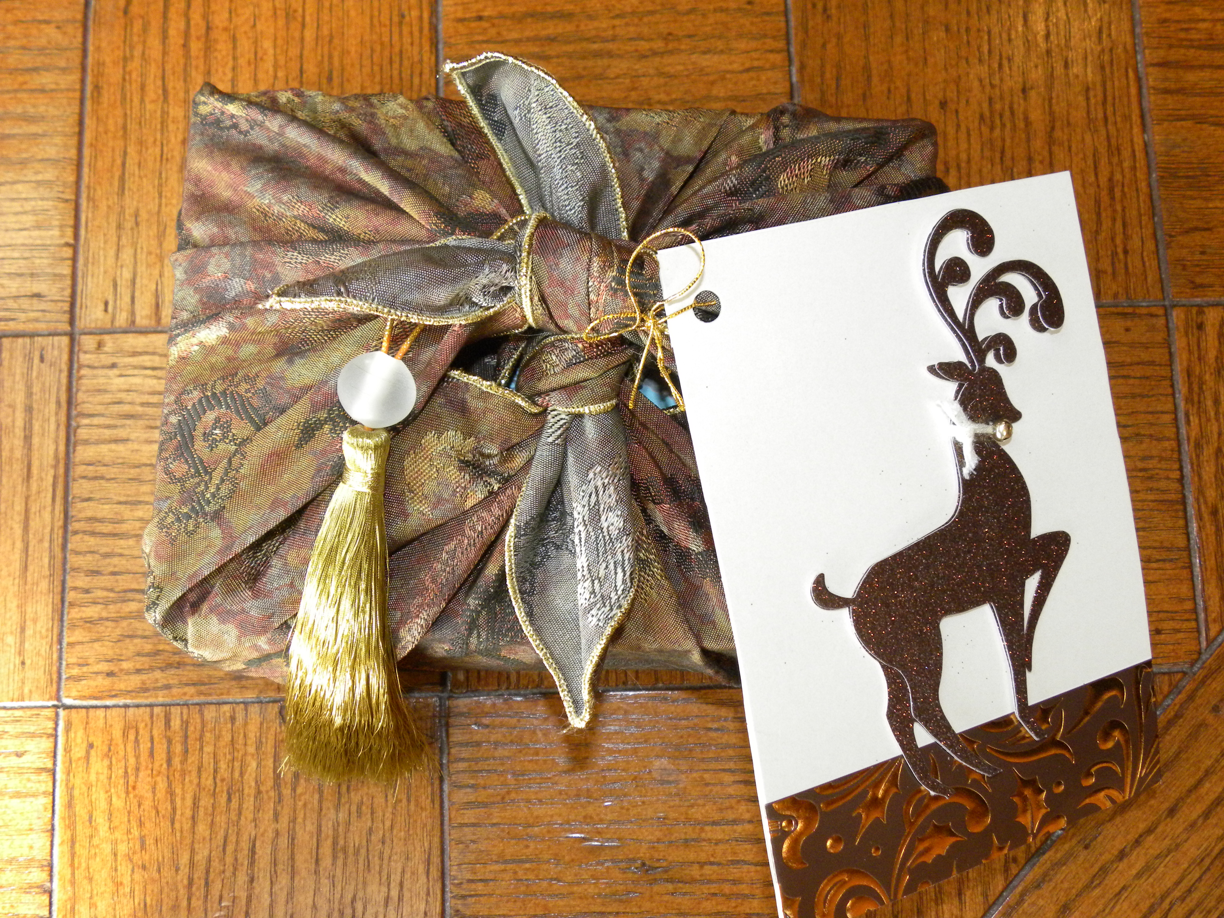 Square fabric gift wrap knotted in place, decorated with a tassel and greeting card gift tag