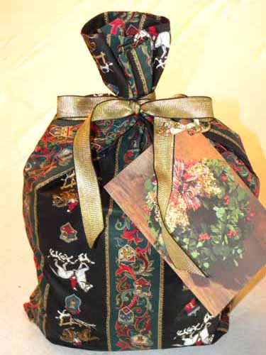 Fabric gift bag with permanently attached (sewn on) ribbon and greeting card gift tag ribbon