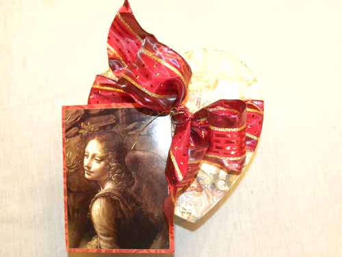 Heart shaped box with wired ribbon and greeting card gift tag