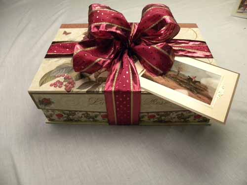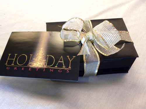 Black satin candy box with wired ribbon and greeting card gift tag
