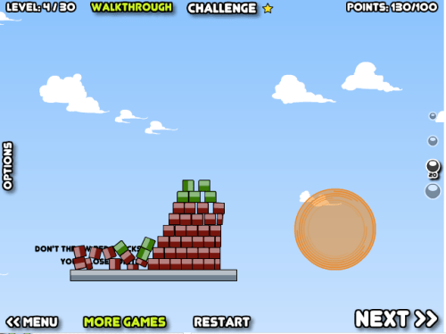 For all you lovers of slingshots, this is a great game. “Buy” a ball (bigger= more expensive), then aim and slingshot it from the orange staging circle into the pile of bricks, knocking off as many green ones as possible. Gets addicting…