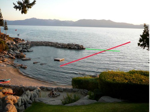 Witness the red line in the photo above. It represents an approximately 200′ swim to a buoy that has been a summer habit for years. In years past, when I was younger and, I thought, “more fit”, I could swim freestyle at a pretty good clip until… I pulled even with the end of the breakwater (the green line).