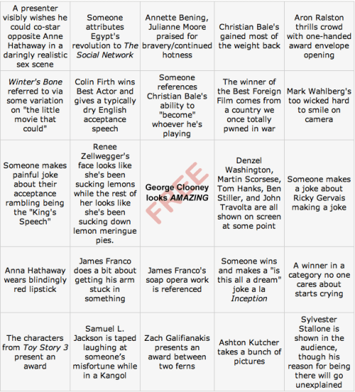 This brings a new twist to the Oscars… click on the image below to access the webpage of Thrillist.com, and you will find this hilarious bingo card graphic. When you get there, you can hit the “Print” button next to it to get your own copy. For each person watching the Oscars with you, hit the “Randomize” button and print again, yielding unique “bingo” cards for each person.