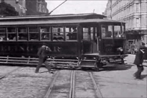 A camera was attached to the front of a cable car traveling east on Market Street in San Francisco, and the view you get tells an amazing amount about life as it was there.