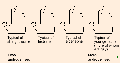 Research …. suggests that greater exposure to testosterone in the womb increases the chances of having a more “masculine” hand, i.e. one with a shorter index finger. This testosterone exposure is also thought to be responsible for the range of traits associated with a low 2D:4D ratio, such as greater aggression and risk-taking behavior.