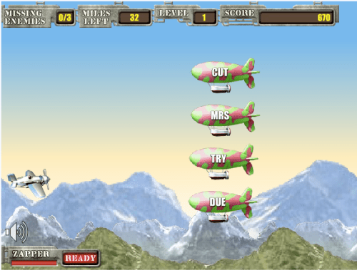 Type the letters and words on the blimps to make them disappear before they pass your plane.