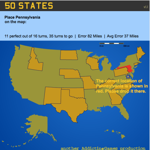 This is perhaps more of a challenge than one would think… Drag and drop the states in their proper location…. and there are no borders drawn to clue you in. If you drop a state in the wrong spot, it shows you in red (see picture below) where it should go.