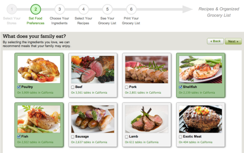 Food On The Table then builds suggestions of recipes, all the while scanning your local circulars for coupons and sales available at your grocery store, and making a point to use those items as it works. You pick the recipes you like (you can add your own favorites as well) and the site generates a shopping list for you, complete with the savings you’ll realize with the sales it finds.